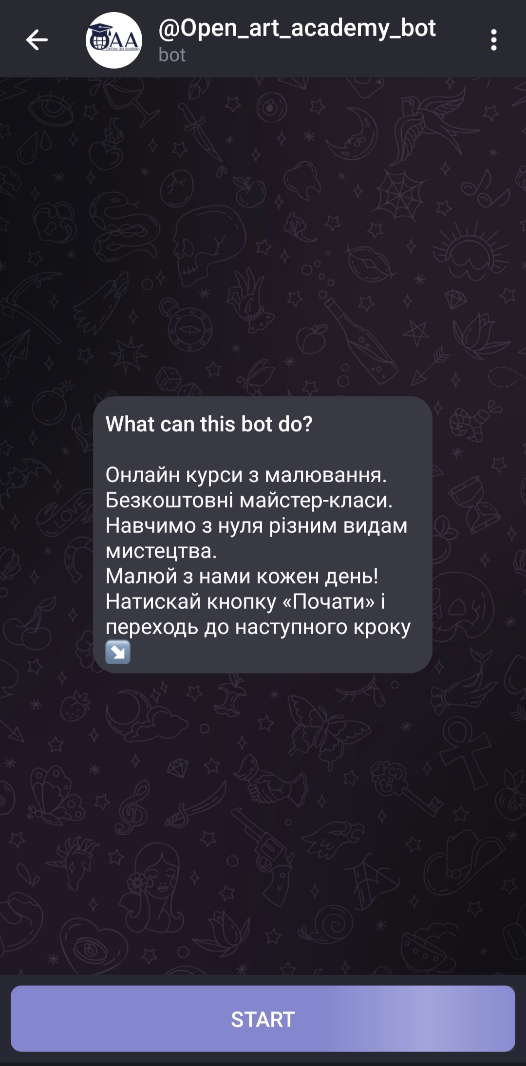 - Нажимаем Поиск сверху, ищем там Open art academy. Точная ссылка — t.me/openartacademy_bot. У вас покажет главный канал академии и бот. Выбираем бот і нажимаем Старт