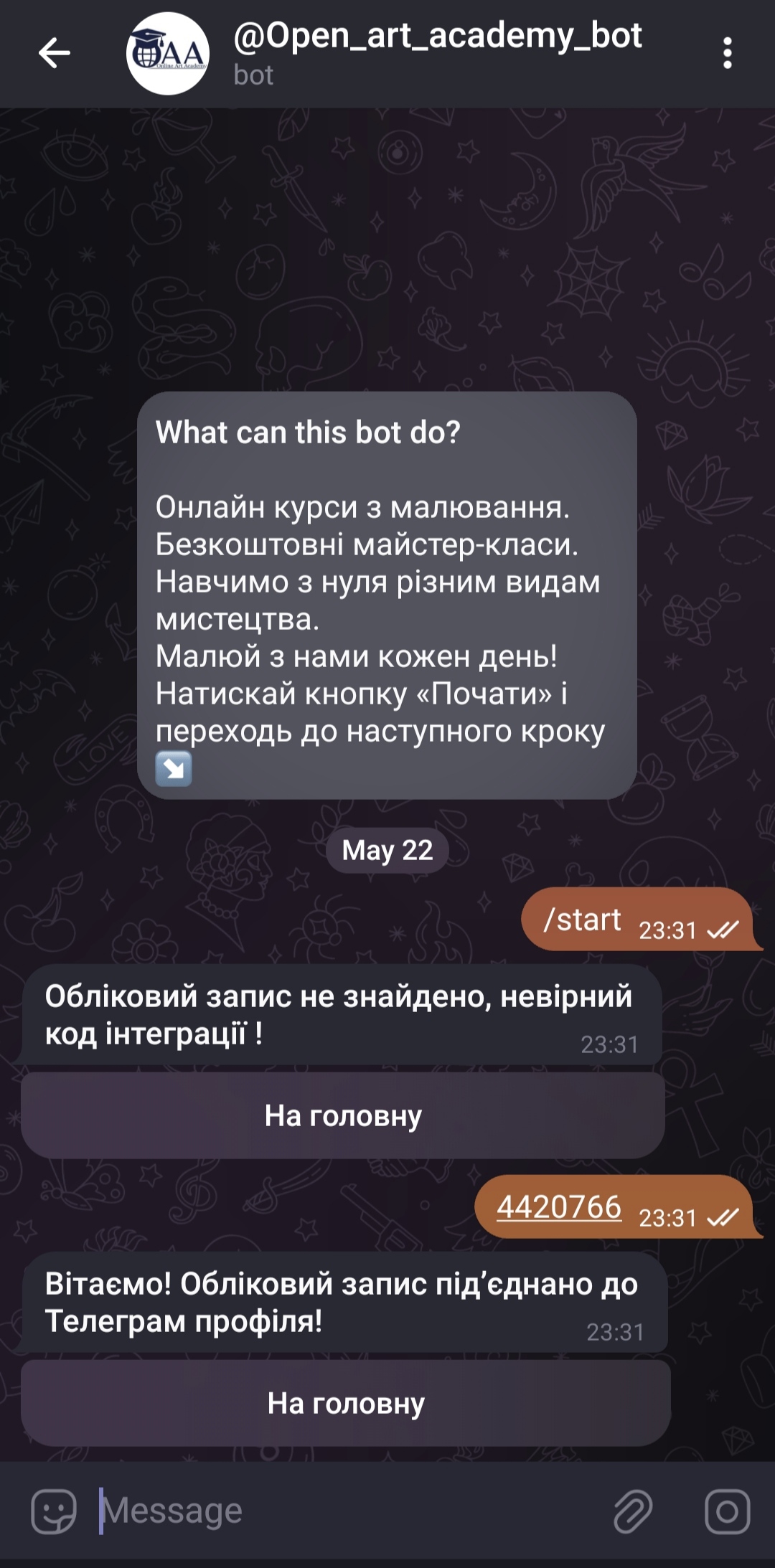- Просто впишите його в бот, и все! Вы подключены — будете получать информацию о курсах, уведомления про проверку домашнего задания и советы от учителя.