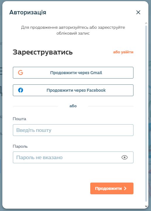 - Нажимаем Продолжить через Google или Facebook, можно и отдельно указывать свою почту