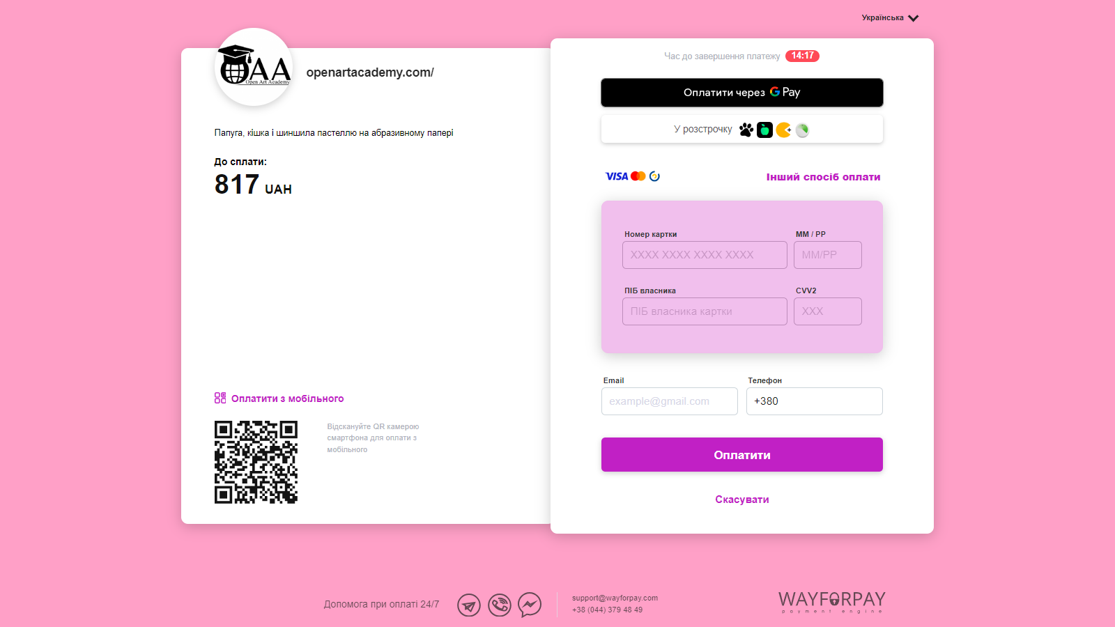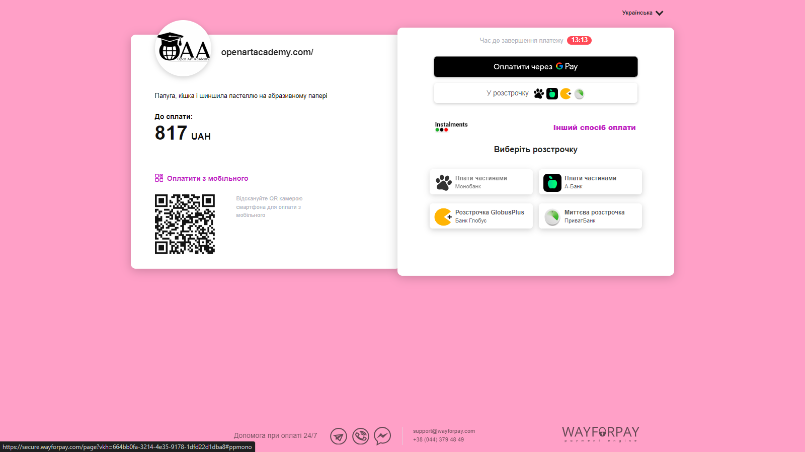 - Нажимаем «Купить» (если курс платный). Если на курсе есть тарифы, выбираем тот, который нравится, и нажимаем «Купить». В новом окне появляется несколько методов оплаты. Оплата проходит через лицензированный сервис WayForPay, все защищено! Вы можете выбрать: оплатить через QR код (через камеру с мобильного), через Google Pay, в расстрочку (в отдельных банках), или иной способ оплаты, указав свою карту. Рассрочка — очень удобный метод оплаты, советуем попробовать (выбираем сверху справа кнопку «В рассрочку», Ваш банк и удобное количество проплат). Вверху на этой странице можете поменять язык. На саму оплату дается 15 минут — это дополнительный способ защиты данных. Если не успеваете, не волнуйтесь, просто нажмите назад и опять «Купить». Если с банком проблемы, внизу есть контакты комании WayForPay, все решается быстро и удобно. Также, пишите нам в соцсетях у личные сообщения, будем рады помочь!